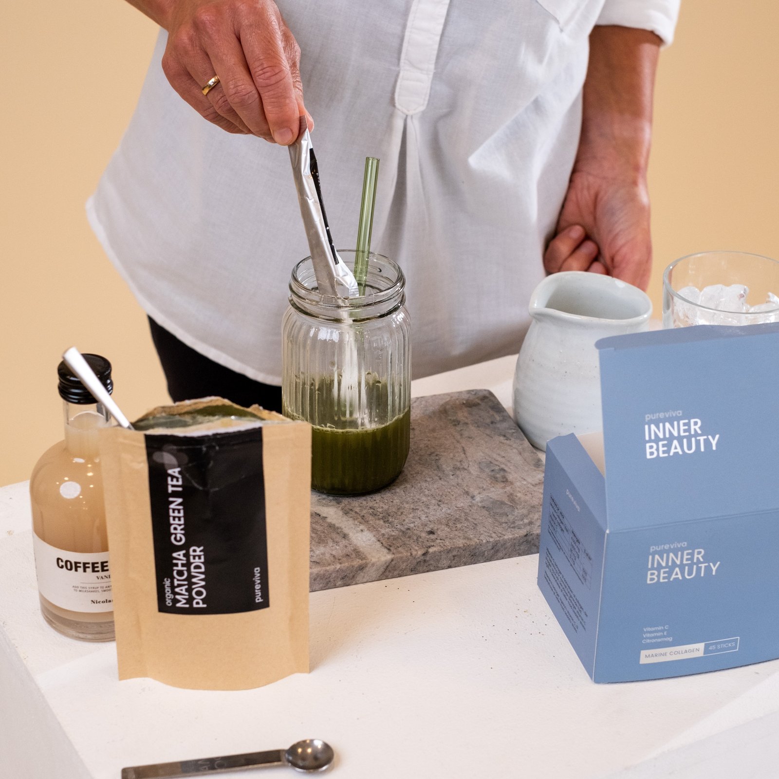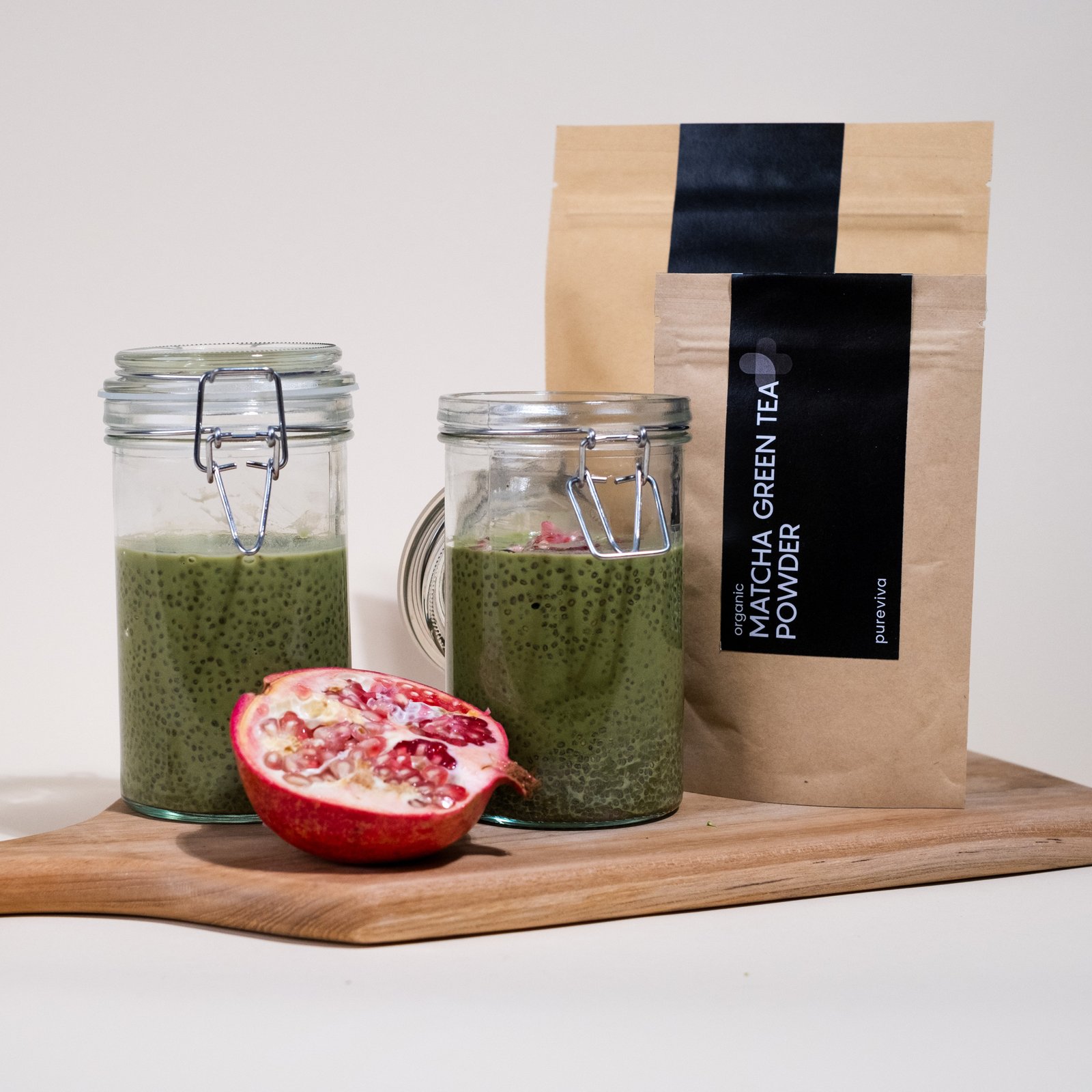 Økologisk matcha-tepulver fra Pureviva – intens grøn farve og frisk smag. Perfekt til te, smoothies og bagværk.
