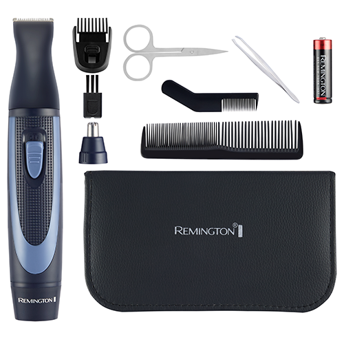 Indeholder: En roterende næse- og øretrimmer, en detaljetrimmer, Opbevaringstaske, Pincet, Neglesaks, Neglefil, Negleklipper, Hårkam, Skægkam og Rengøringsbørste