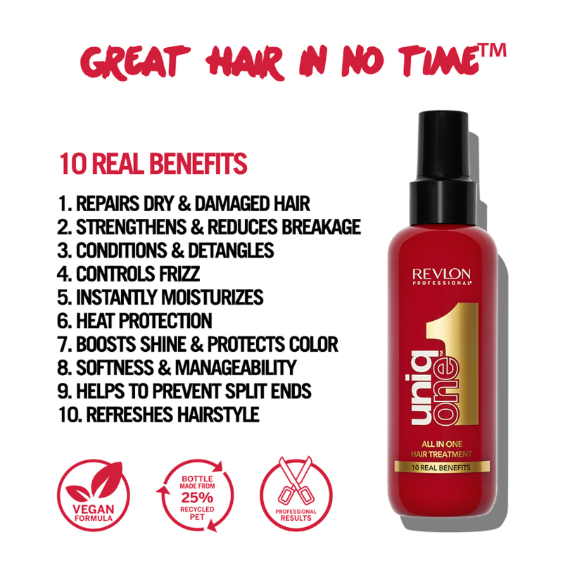 Oplev følelsen af silkeblødt og glansfuldt hår med Revlon Uniq One. Denne alsidige leave-in behandling giver dit hår alt, hvad det behøver med 10 fordele i én, fra varmebeskyttelse og reparation til fuld kontrol over krus.