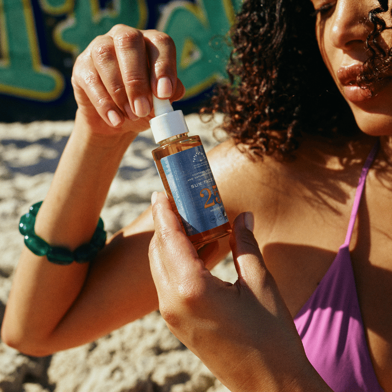 Sun Face Oil SPF 25 er en fugtgivende og plejende ansigtsolie, der beskytter huden i ansigtet mod solens stråler med solfaktor 25. Sun Face Oil har en opstrammende effekt og forbedrer hudens tekstur og tone. Konsistensen føles let og delikat på huden, og olien trænger hurtigt ind. Det høje indhold af aktive ingredienser arbejder med huden – som algeekstrakt, rig på omega 3-6-9 fedtsyrer, der opretholder hudens smidighed og blødhed. Havtornolie booster huden med vitamin C – imens hybenroseolie gennemfugter huden og efterlader den med elasticitet og glød.