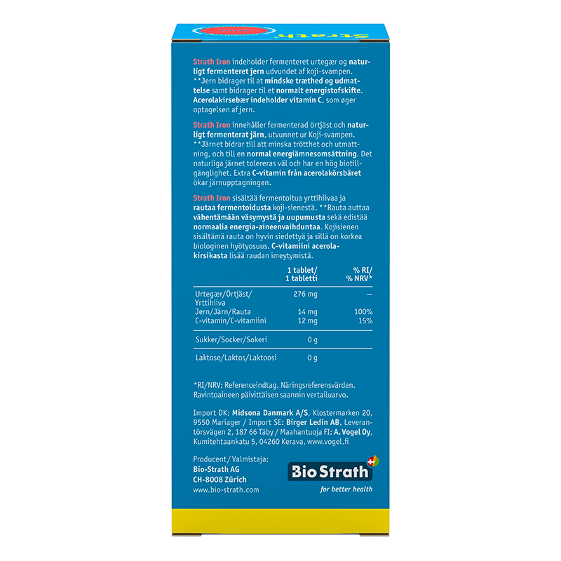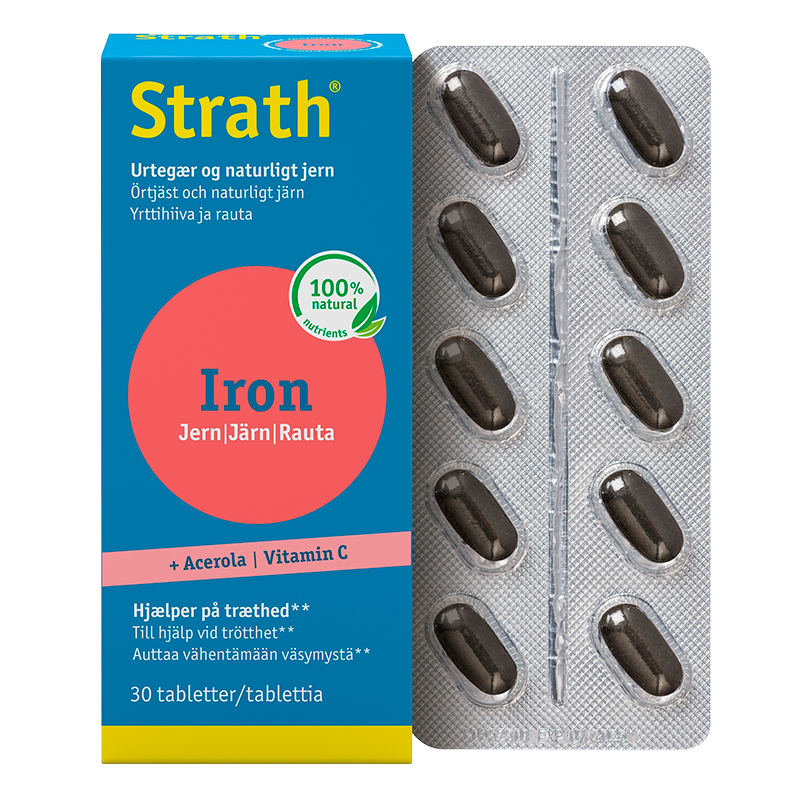 NATURLIG JERNTILSKUD MED VITAMIN C Strath Iron indeholder naturlige ingredienser. De er lavet af en kombination af naturligt fermenteret jern fra koji-svamp og fermenteret urtegær samt naturligt vitamin C fra acerolakirsebær.