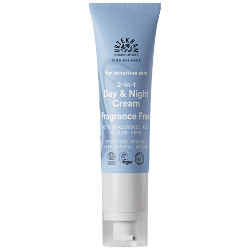 Urtekram Find Balance Fragrance Free 2in1 Moisturizing Day & Night cream er en parfumefri og allergicertificeret 2i1 dag- og natcreme til sensitiv hud. Det er en beroligende og nærende ansigtscreme, som hjælper din hud til at se sund og frisk ud. Dag- og natcremen indeholder fugtgivende aloe vera, blødgørende kokosolie og hyaluronsyre, der hjælper med at bevare hudens fugtbalance.