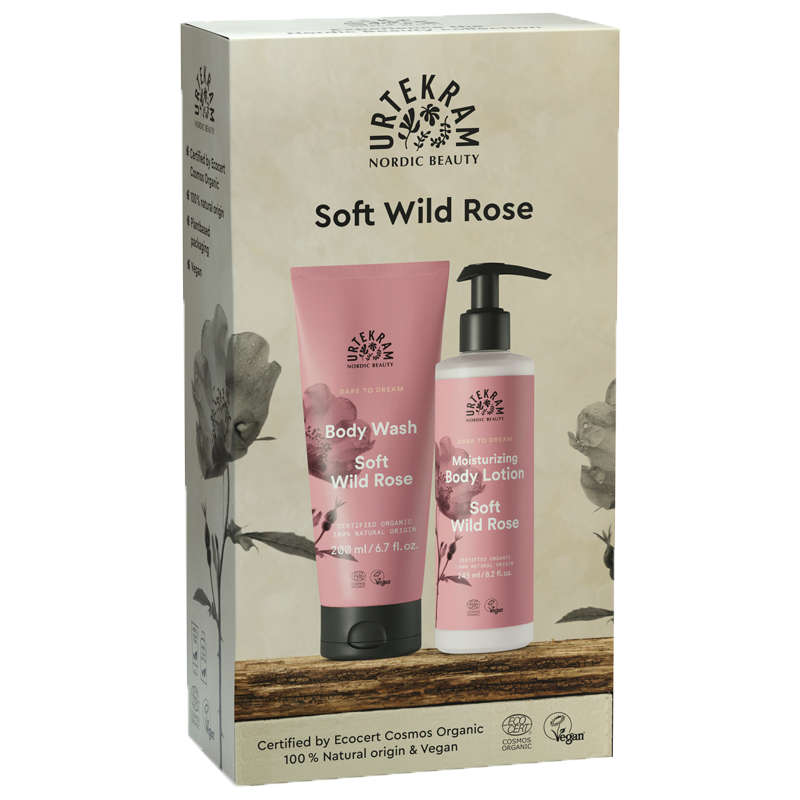 Urtekram Soft Wild Rose Gaveæske indeholder body wash og bodylotion med duft af vilde roser. Produkterne er økologisk certificeret af Ecocert COSMOS Organic og indeholder ingredienser med 100% naturlig oprindelse