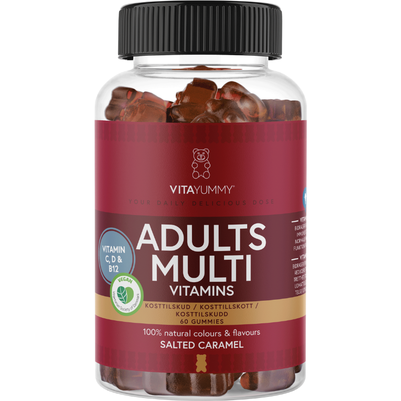 VitaYummy Adults Multi har en Salted caramel smag, og den naturlige farve kommer fra æble, gulerod og hibiscus.