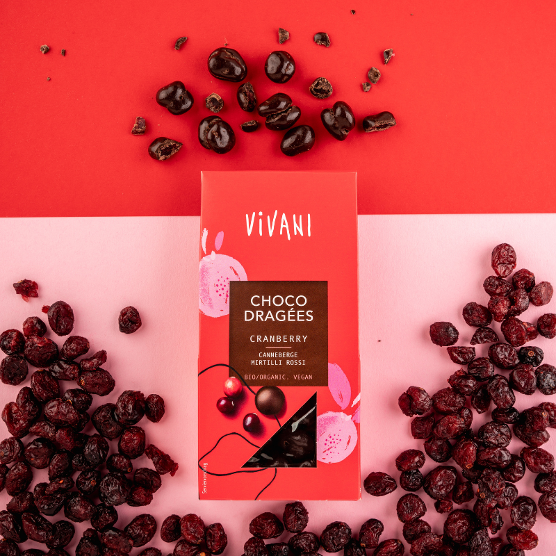 Den fineste økologiske mørke chokolade med et kakaoindhold på 53% bruges til VIVANI Choco Dragées-serien. Tranebærvarianten indeholder smagfulde, sødede tranebær. Chokoladeindholdet i de fine kugler er 65%.